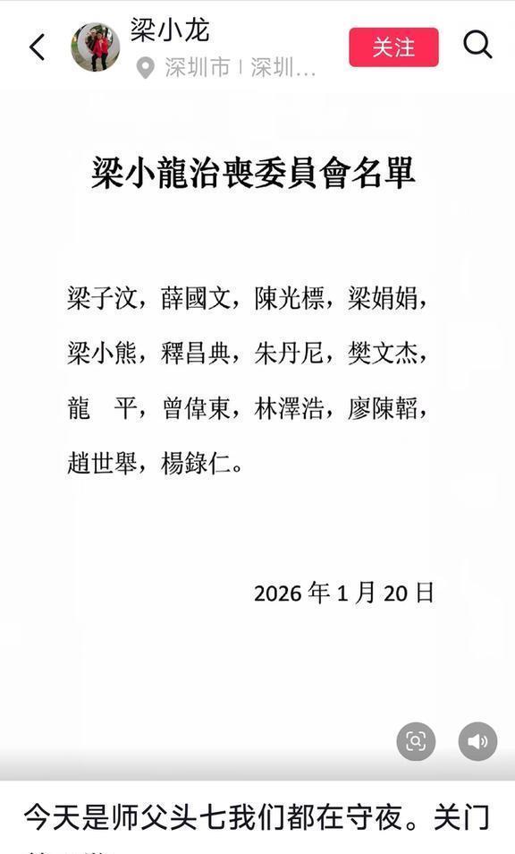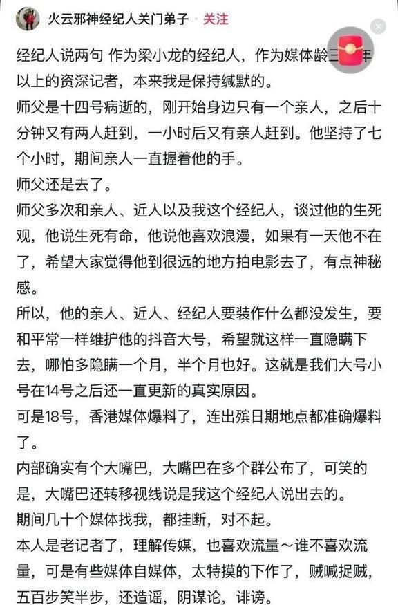 头七那天,他还在梁小龙的大号上发了文,和其他徒弟们一起给师父守夜。看得出来,他们心里也挺不好受的,悲伤是真的。但就是因为最开始没及时发讣告,结果让后来的各种猜测变得越来越荒唐,简直没边儿了。